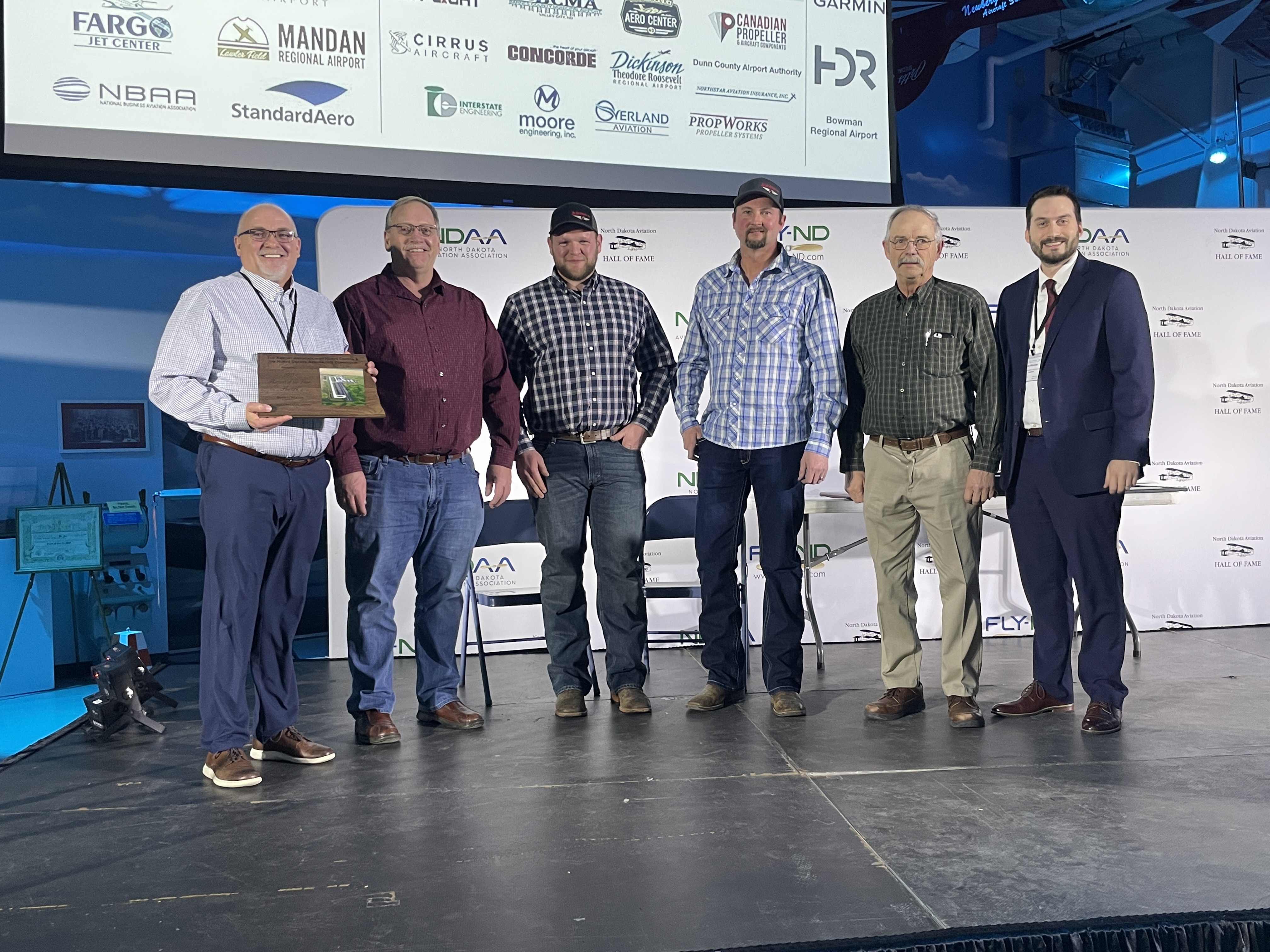 Hillsboro Regional Airport receives the 2021 General Aviation Airport of the Year award during the North Dakota Aviation Association’s FLY-ND Conference awards banquet on March 8th, 2022. Accepting the award for the airport are, from left to right, Larry Mueller, Les Hurt, Devon Cote, Chad Hanson, and Don Hanson, and presenting the award is Kyle Wanner (Executive Director, ND Aeronautics Commission).