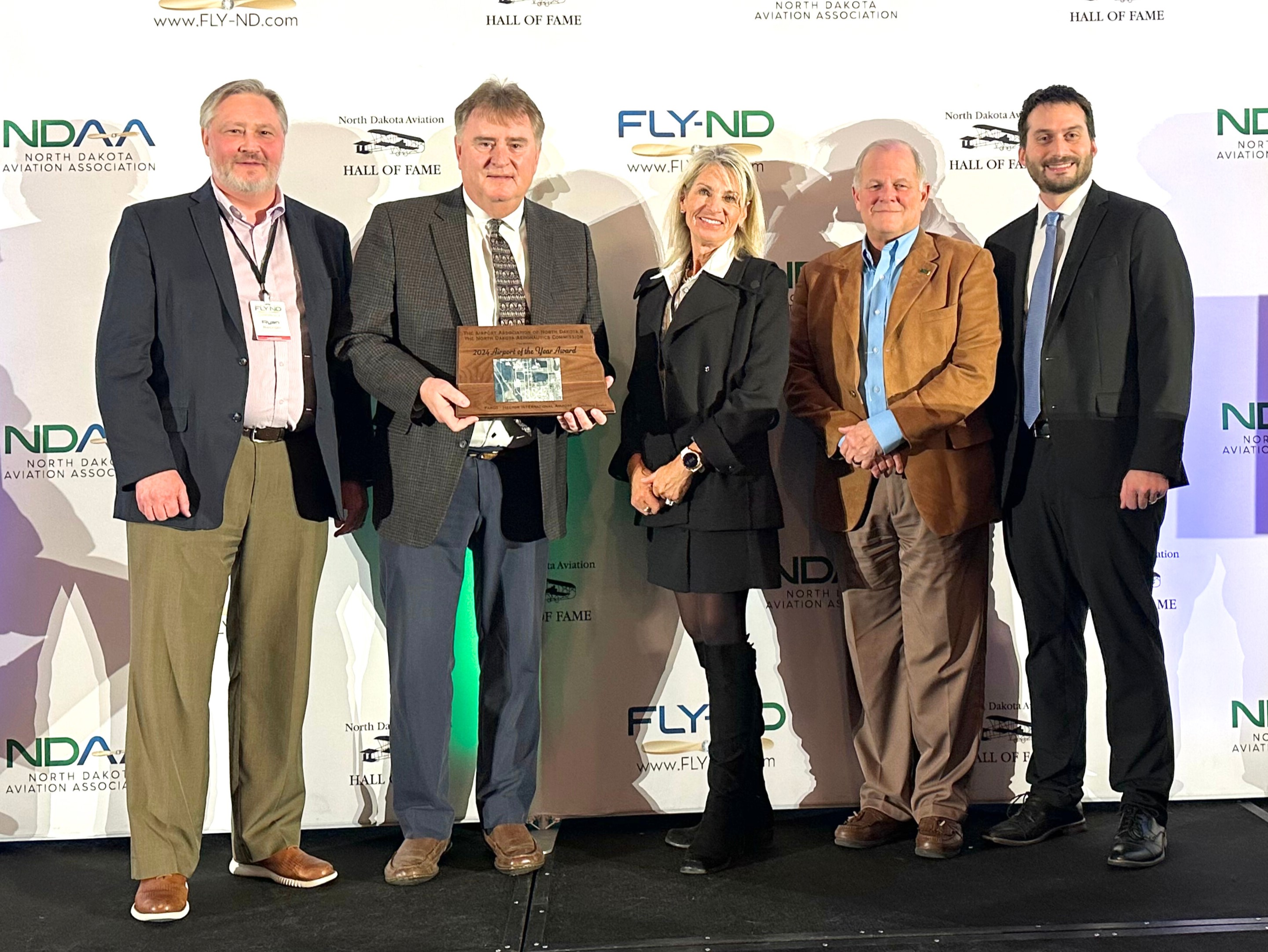 The Fargo, Hector International Airport receives the 2024 Commercial Service Airport of the Year award during the North Dakota Aviation Association's FLY-ND Conference awards banquet on March 4th, 2025. Pictured from left to right is Ryan Riesinger (President of the North Dakota Airport Association), Shawn Dobberstein (Airport Director), Paula Ekman (Chair of the Fargo Airport Authority), Dean Bresciani (Member of the Fargo Airport Authority), and Kyle Wanner (Executive Director of the North Dakota Aeronautics Commission)
