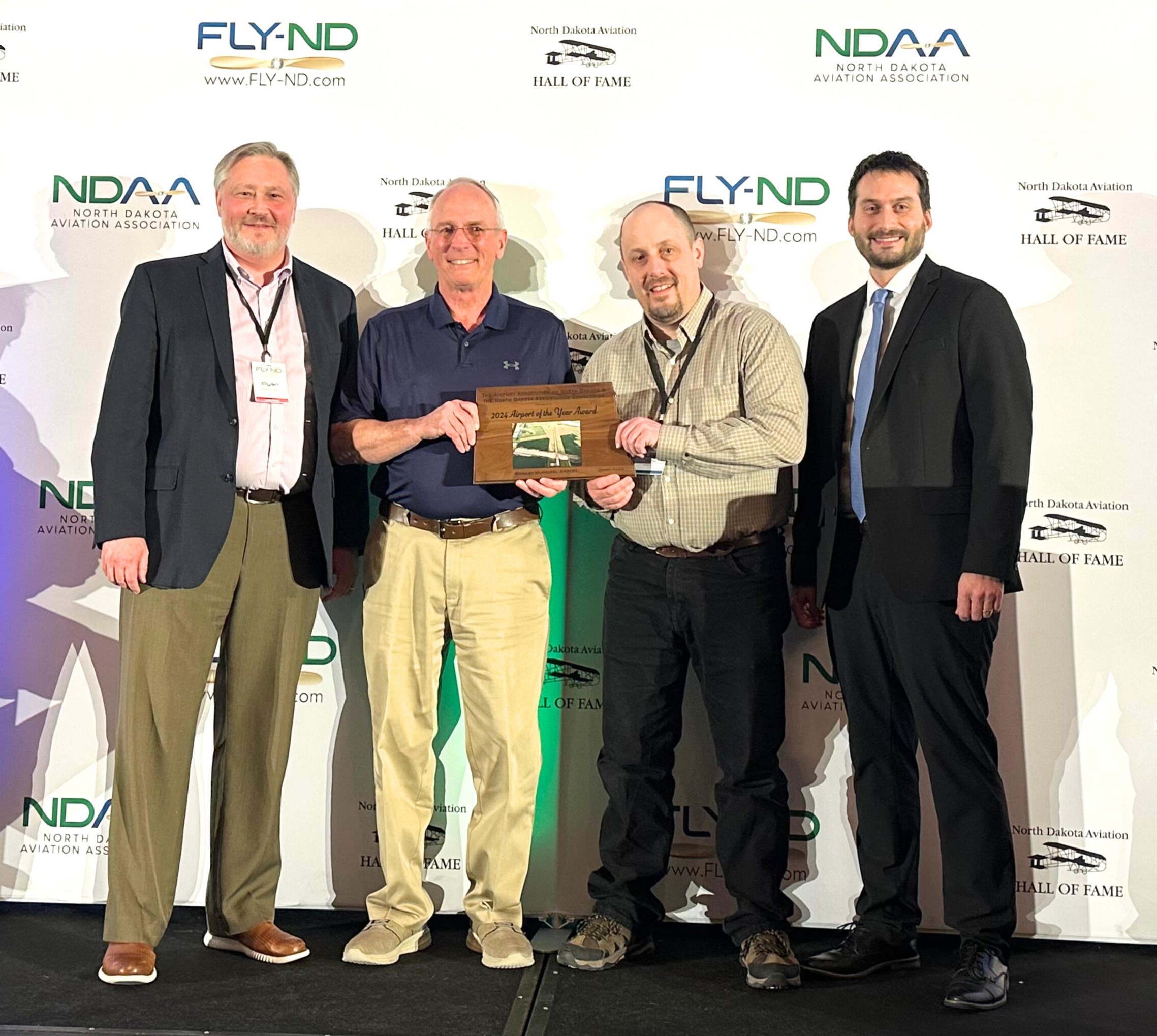 The Stanley Municipal Airport receives the 2024 General Aviation Airport of the Year award during the North Dakota Aviation Association's FLY-ND Conference awards banquet on March 4th, 2025. Pictured from left to right is Ryan Riesinger (President of the North Dakota Airport Association), Greg Johnson (Stanley Airport Board Board Chair), Jon Walters (Stanley Airport Board Member), and Kyle Wanner (Executive Director of the North Dakota Aeronautics Commission)
