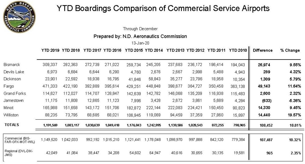 North Dakota Airport Passenger Boardings up 10% in 2019