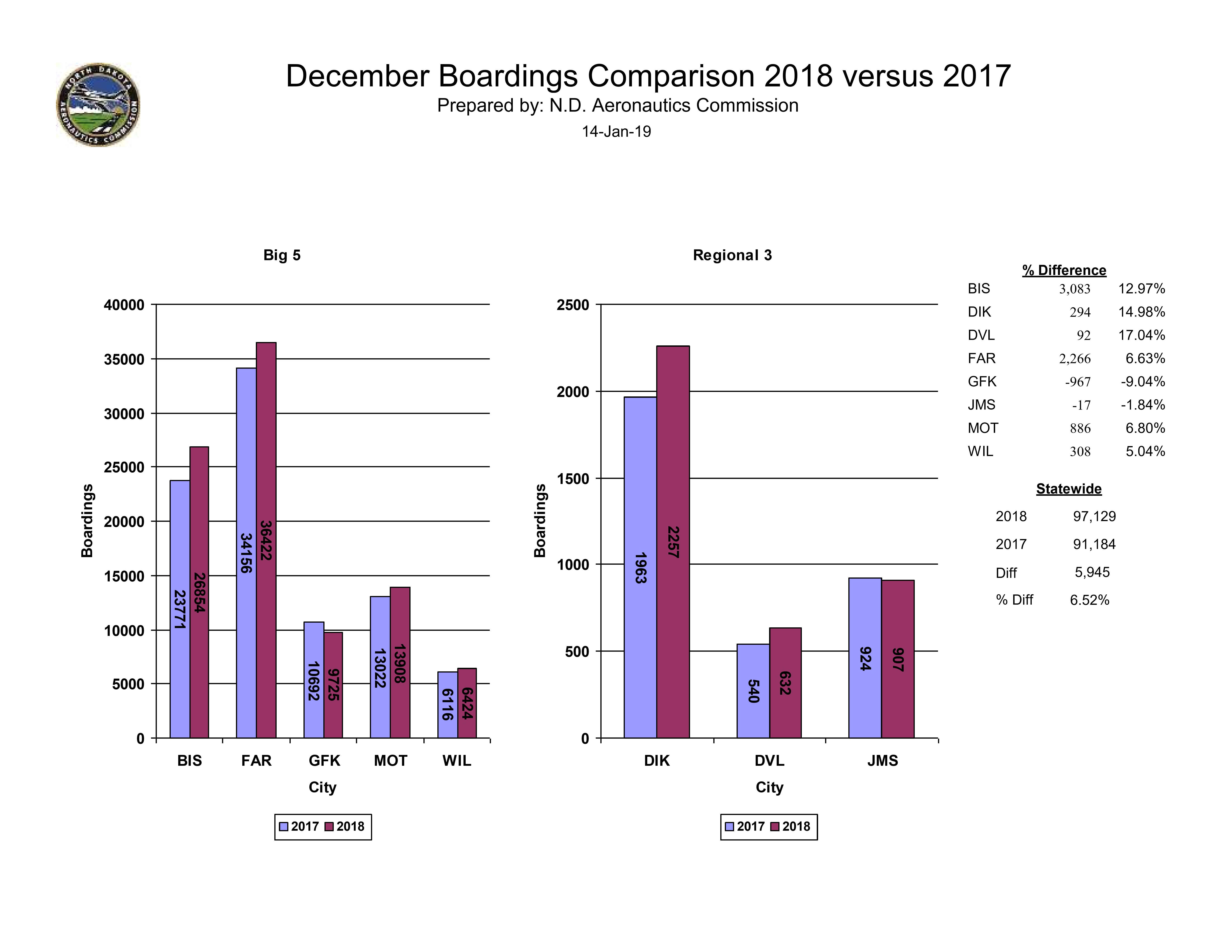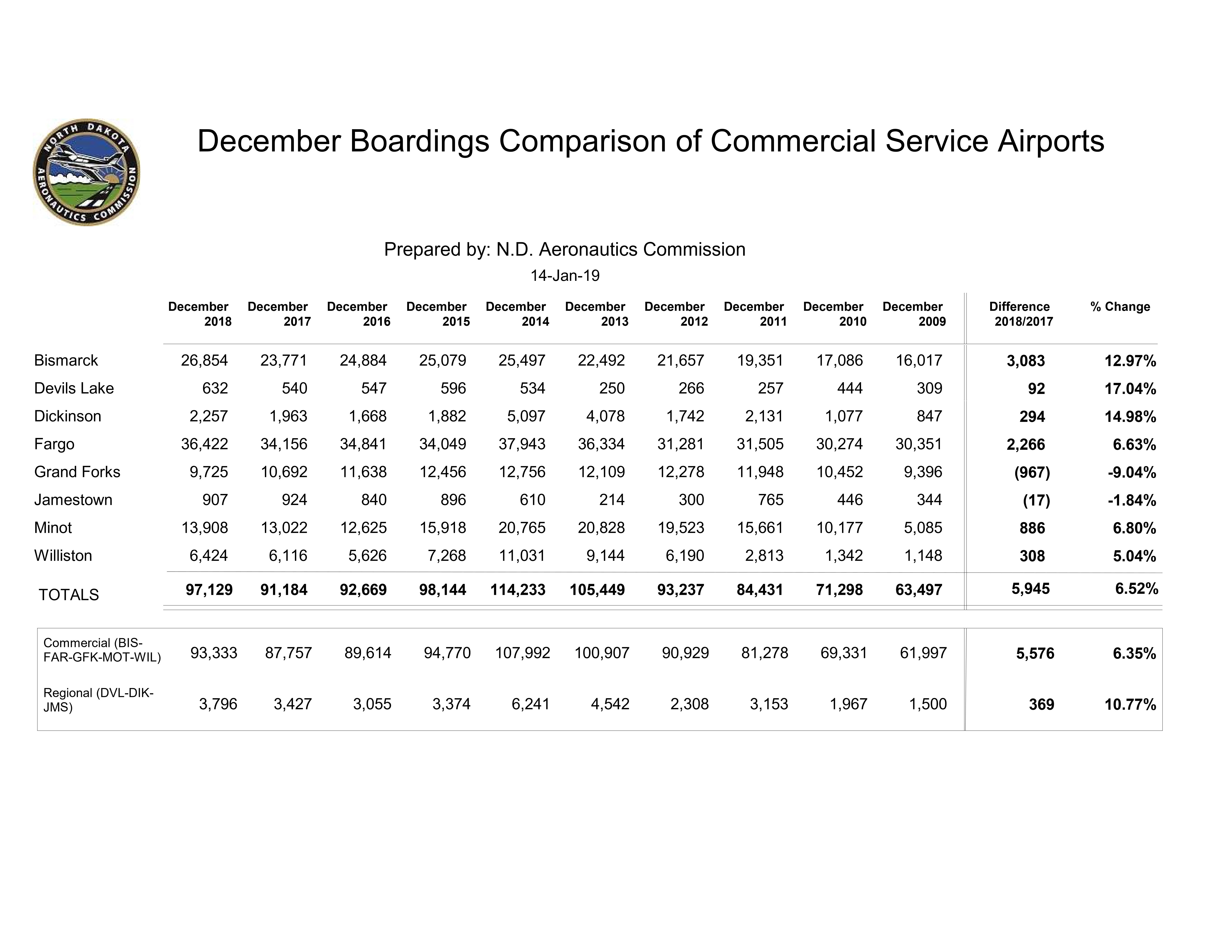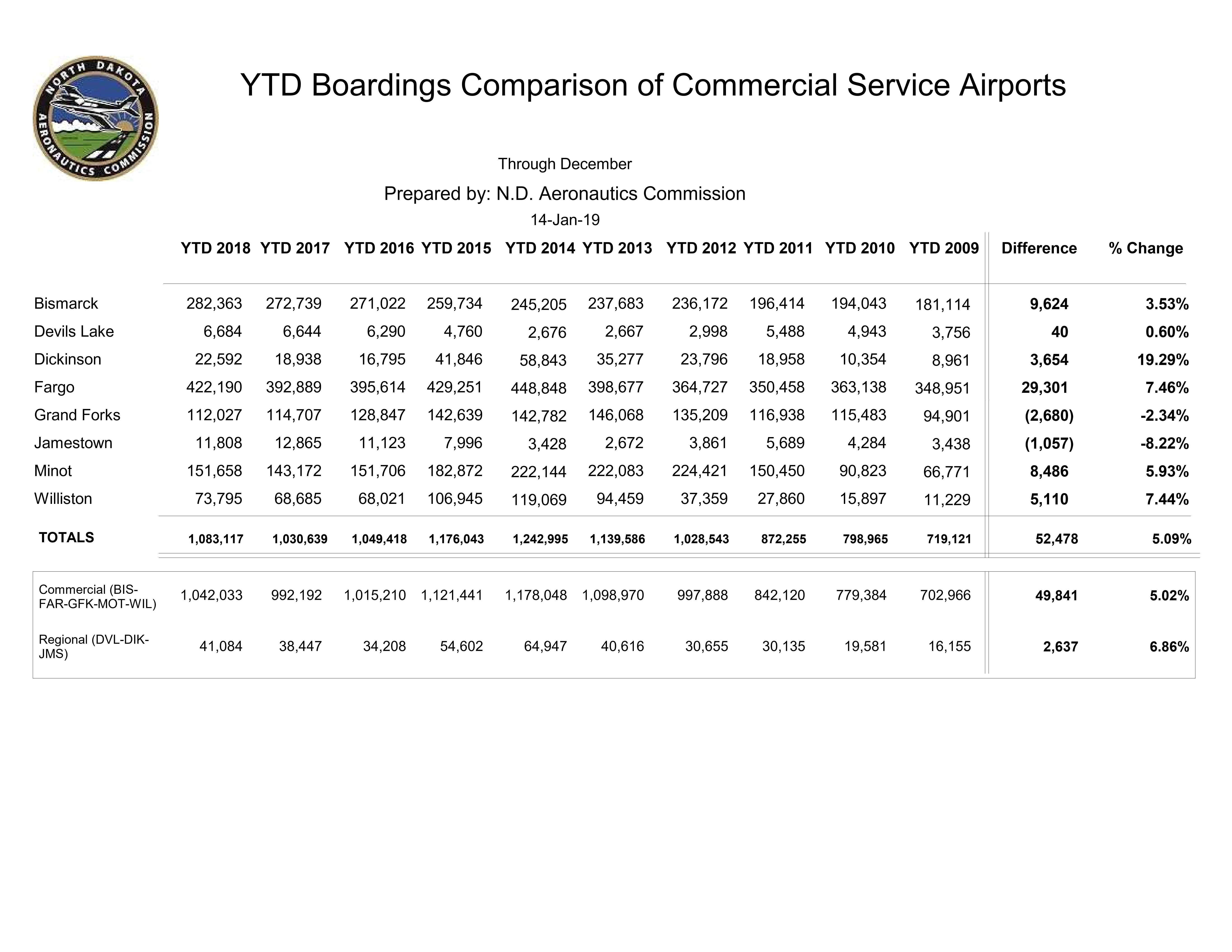 North Dakota’s commercial service airports finished calendar year 2018 with a statewide total of 1,083,117 passenger boardings. This is a growth of 52,478 passengers or a 5% increase from 2017 numbers.