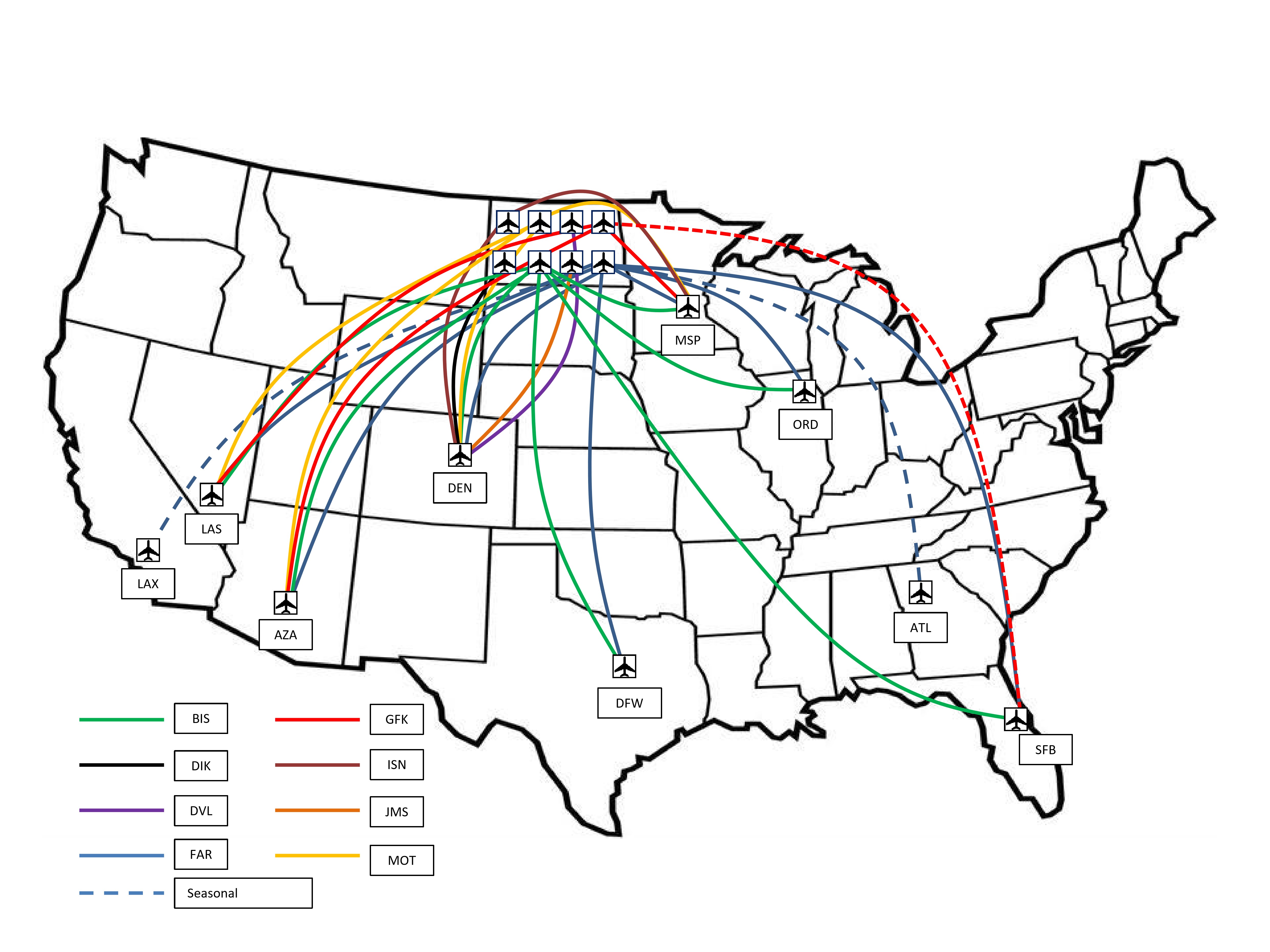 The increased number of passengers throughout the state has allowed communities to attract and retain additional air service opportunities. 9 non-stop destinations (of which two are seasonal) are currently available to connect North Dakota to the rest of the world. All eight of the commercial service airports also continue to provide their communities with reliable jet service. The state is currently averaging approximately 55 airline flight departures per day with an estimated 3,800 available daily seats. The top destination airline passenger markets in 2018 for North Dakota travelers were as follows: