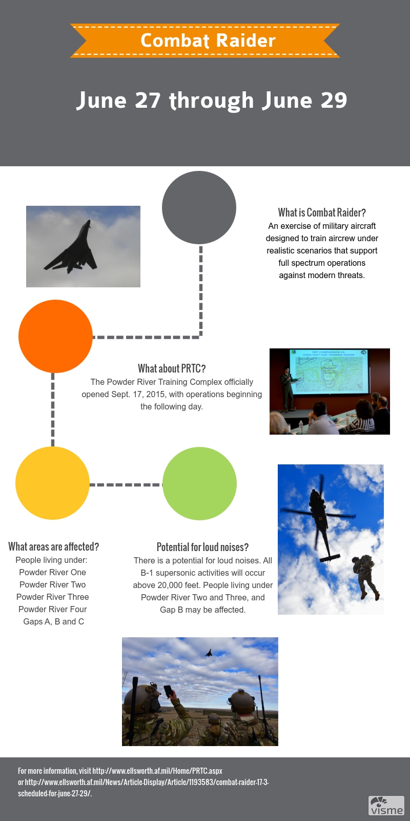 ELLSWORTH AIR FORCE BASE, S.D. – Combat Raider, a large force exercise involving various military aircraft, is scheduled to begin June 27 in the Powder River Training Complex, and will conclude June 29, 2017.