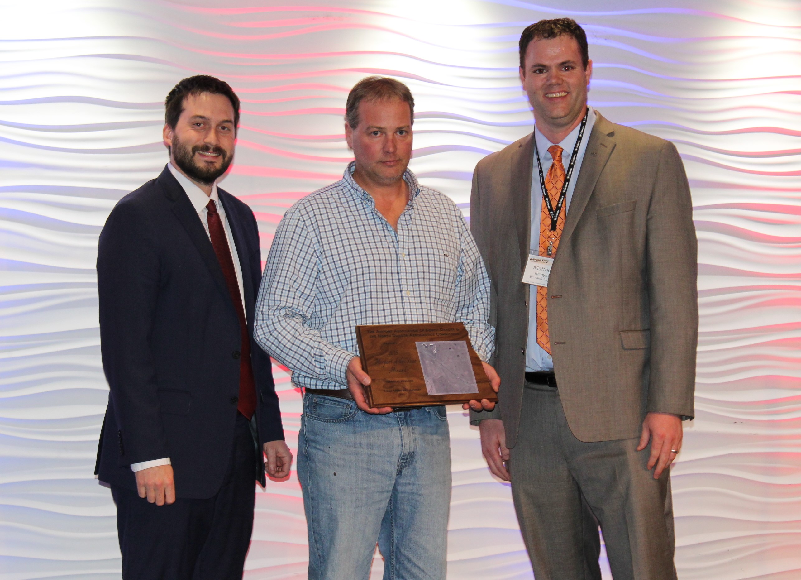 Tioga Award Photo - Left to Right: North Dakota Aeronautics Commission Executive Director - Kyle Wanner, Tioga Municipal Airport Authority Manager and Chairperson - Chris Norgaard, and Airport Association of North Dakota President - Matthew Remynse